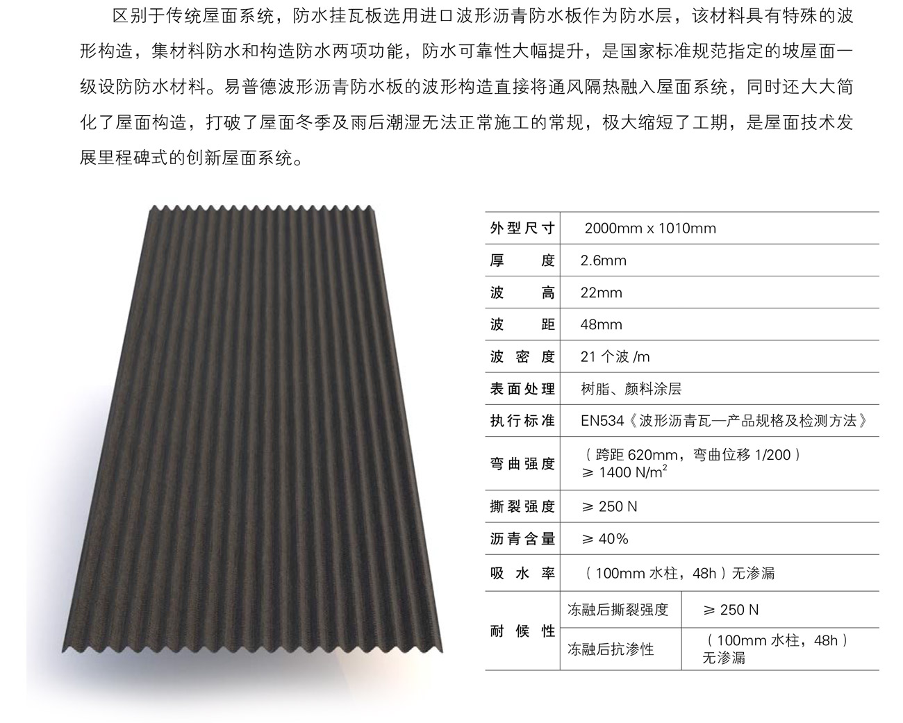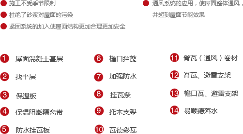 借鑒歐洲坡屋面防水理念,將平面防水改為立體防水,采用新型防水板材料,將材料防水和構造防水于一身,配合屋面系統組件,實現全天候全干作業(yè)。節(jié)省了屋面各類保護層次,打破了屋面冬季及雨后陰濕無法施工的常規(guī),縮短了工期,提升系統安全性能。